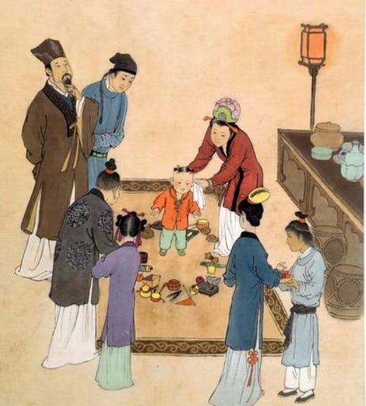 Image 1: a painting of zhua zhou 抓周 (first-birthday divination ritual) from 《古代风俗百图》 (“A Hundred Paintings of Ancient Customs”) by artist Wang Hongli 王弘力 (1927-2019)