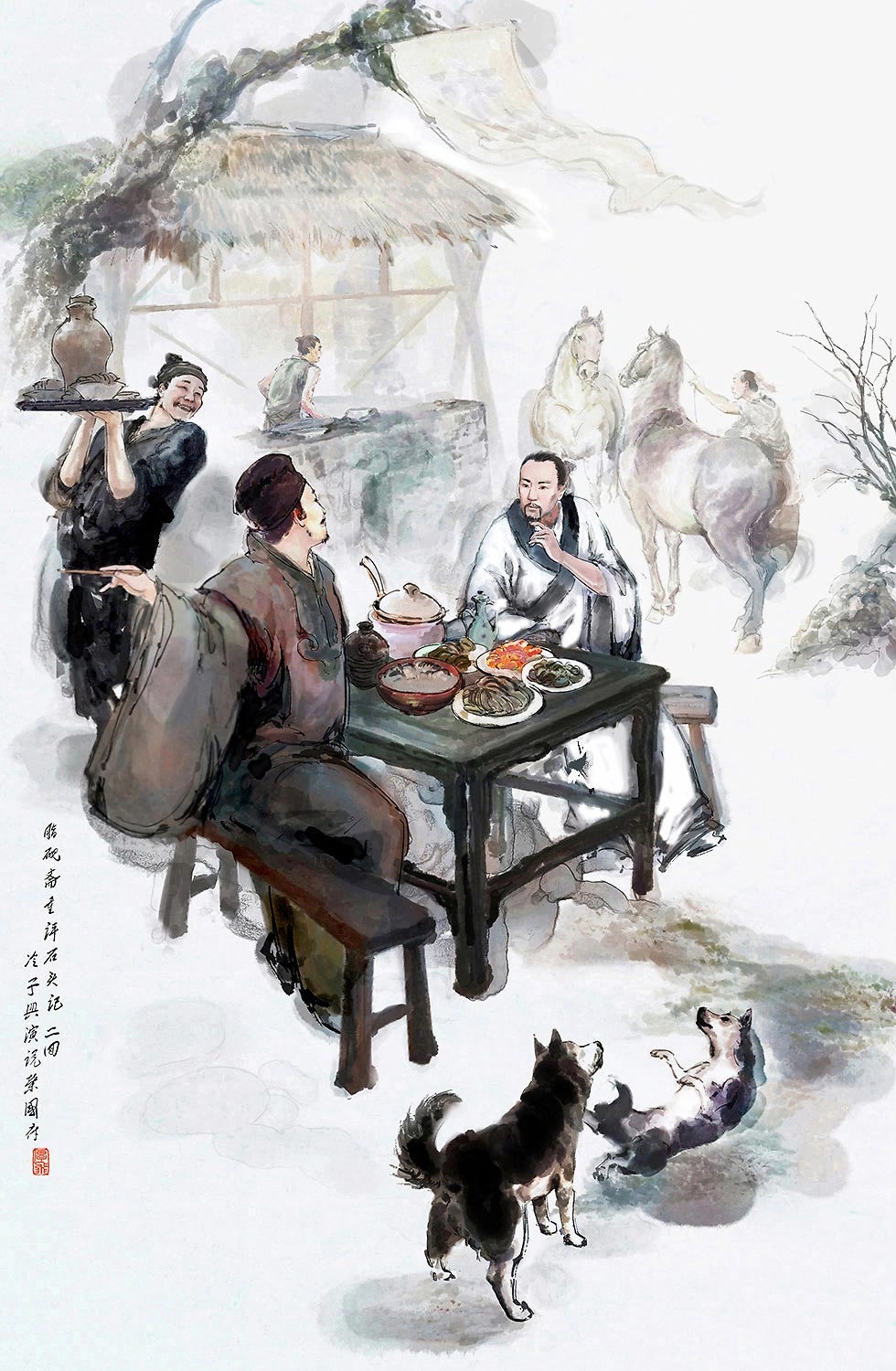 But when he went in, he found no one inside except a doddering old monk cooking a pot of porridge. He asked after the author of the mottoes, but the man seemed a bit deaf and perhaps not in his right mind, and Jia could make neither head nor tail of his nonsensical replies. Growing impatient, Jia went back out of the temple and betook himself to a tavern down the road, thinking that a cup of wine in these quaint environs would be a fine thing indeed. No sooner had he stepped though the door, though, than a man drinking at one of the tables stood up and cried out in a jovial voice: "Well, if it isn't Jia Yucun!"