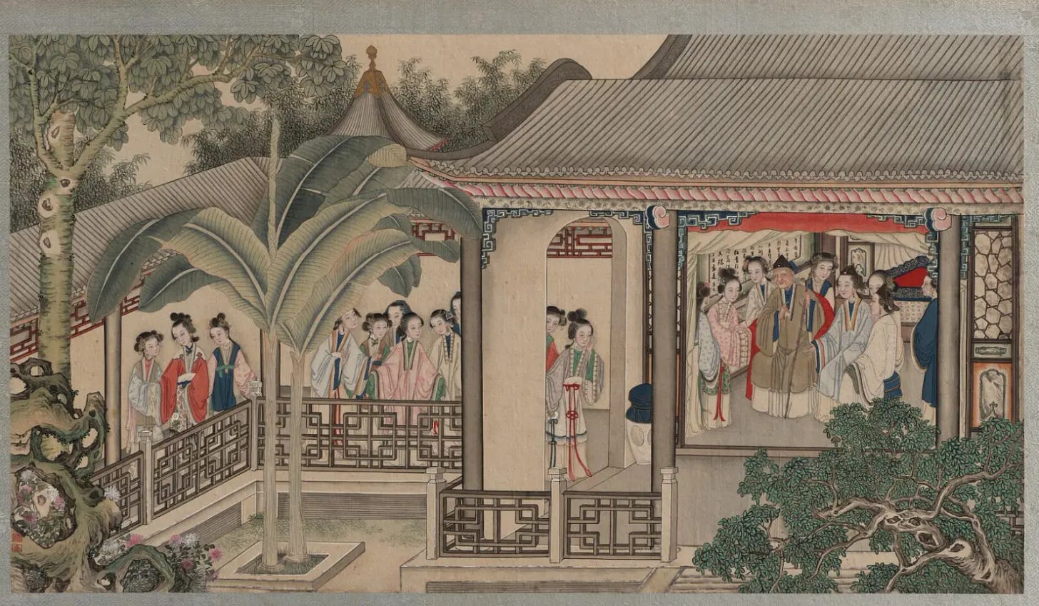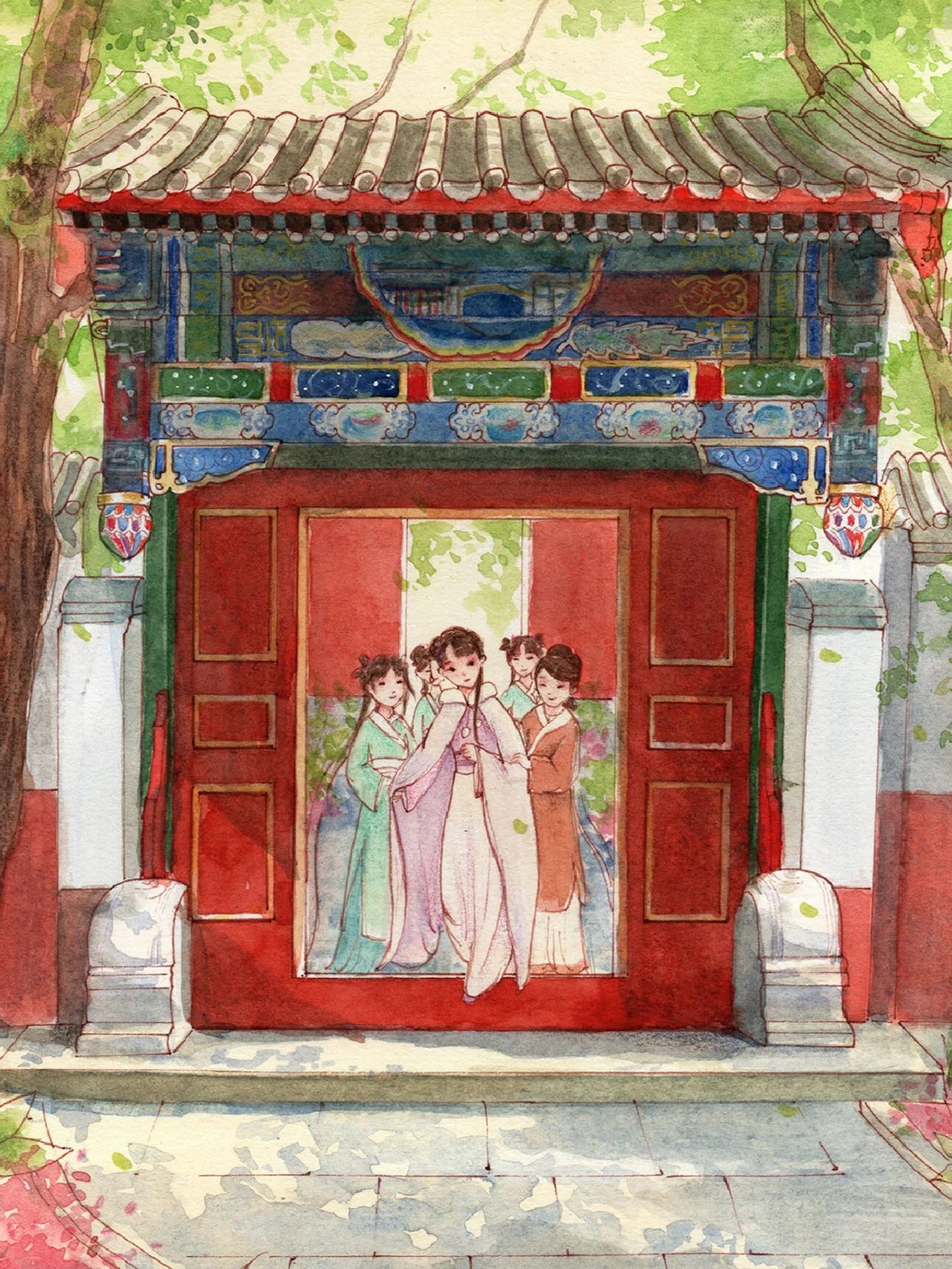 She was carried in through a side door, but after they had travelled a short distance and were about to turn a corner the porters set her down and four handsome pages took their place. The matrons, who had dismounted behind her, now followed on foot. At length they came to a large canopied doorway, where the pages set her chair down again and stood respectfully aside, and now the matrons drew back the curtain and helped her out. One took her by the hand and led her through the doorway, behind which stood a great marble screen in a rosewood frame blocking the view, with covered galleries running off to either side. She was led around the screen, through a little parlor, and out into the central courtyard. Before them rose the great hall, lavish with painted pillars and fanciful scrollwork, and on either side stood lesser halls from whose colonnades hung the cages of parrots and songbirds. On the steps of the great hall sat a small crowd of elaborately dressed maidservants, who on seeing them rose and greeted them with cheerful cries: "Here she is! Her Ladyship was just wondering about you!" They scrambled to pull back the curtains, and one called back, “Miss Lin is here!”