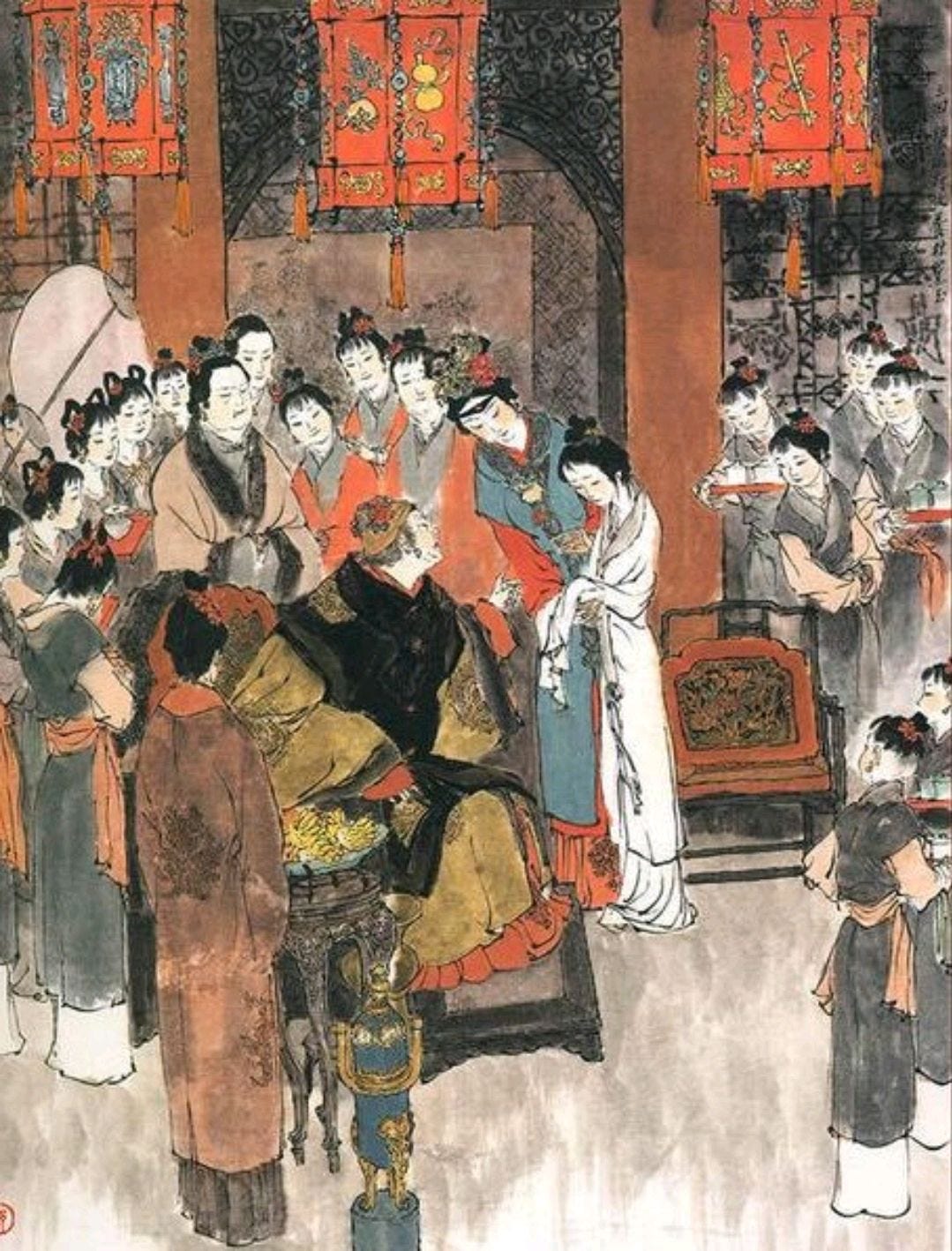 Grandmother Jia nodded to Lady Wang, and Daiyu's cousins were then seated: Yingchun first on her grandmother's right, Yuanchun second on her left, Xichun second on her right. Maids stood ready with napkins, spittoons, and dusters while Xifeng and Lady Li served. The adjoining rooms were aswirl with servants, but not a sound was heard. The meal proceeded in silence.